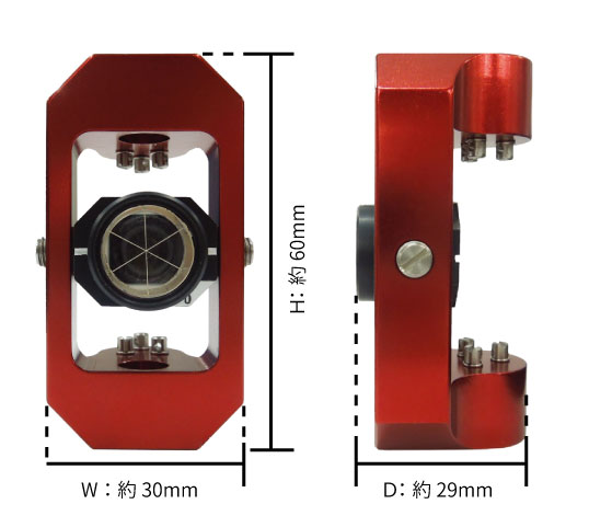 自動視準機対応(ミラー定数0mm及び-7mm)の小型プリズムです。本体上下に2個の気泡管が付いていますので、伸縮ポールに取り付け、反転させて使用する場合でも、そのまま観測を続けることが可能です。